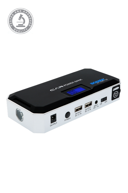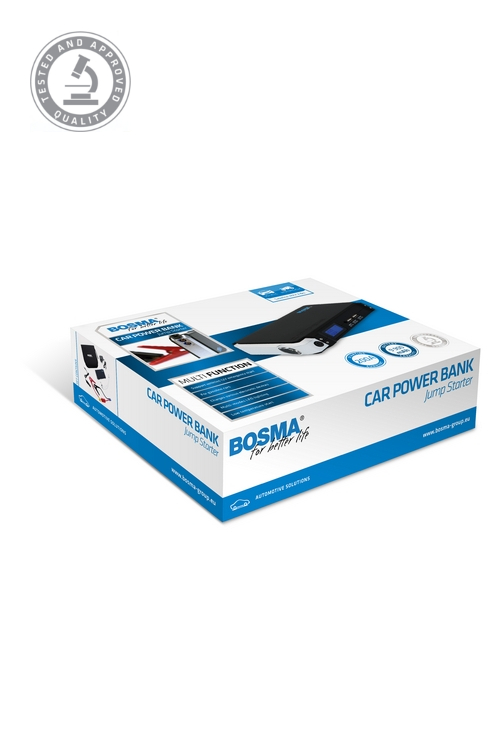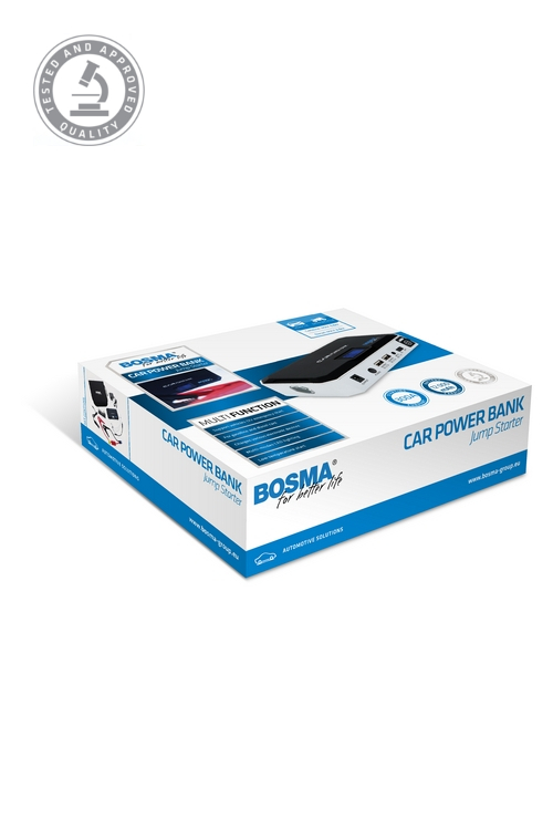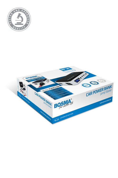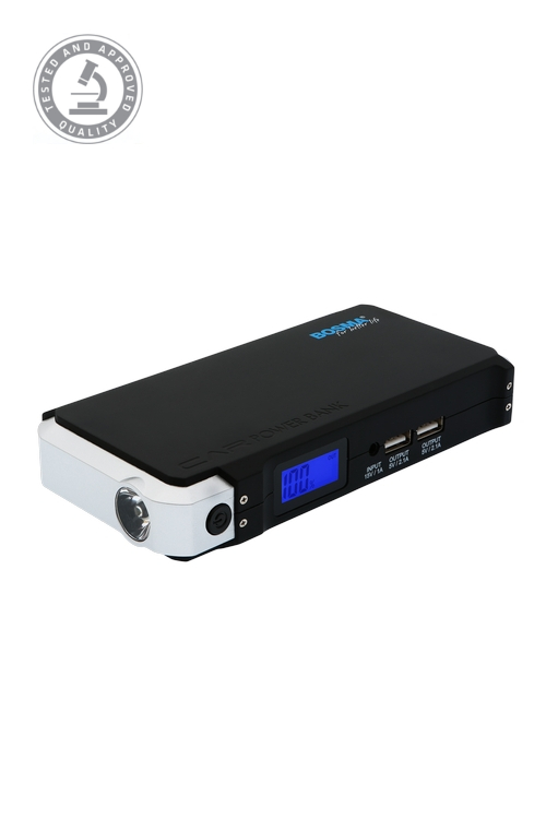 BOSMA CAR POWER BANK JUMP STARTER is a modern bank of back-up power that can start up vehicles. Has your battery died? Do you need extra power to start your vehicle’s engine? All you need on hand is this device, and you’ll be able to deal with this problem yourself. The small size and practical case mean that it will fit into a backpack, travel bag, and even a handbag! When traveling and your phone or laptop die unexpectedly, the power bank will come to your rescue. It also has a mini torch with a warning light mode.