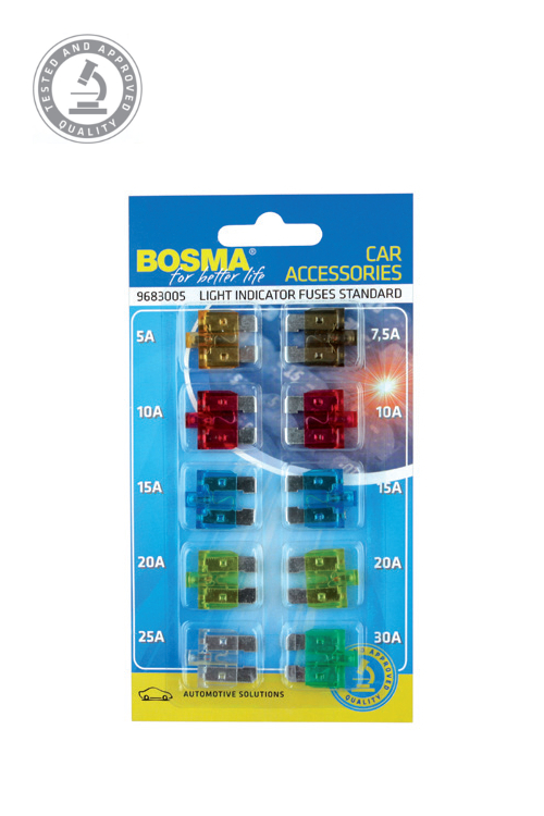 BOSMA FUSES are made with great care paid to the high quality of components used. The standardised colours will help you easily chooose the right type, while the wide range will give you freedom in choosing the right fuse. In addition to the STANDARD version, we also have the LIGHT INDICATOR version, which is equipped with a light alerting you if the fuse has blown.
