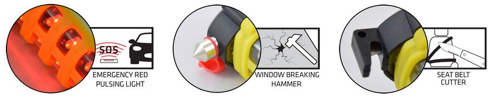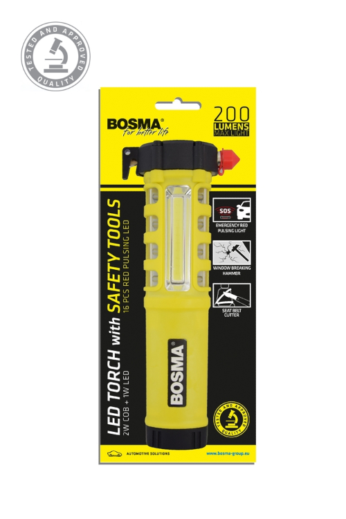 This torch should be at hand, aboard each vehicle! It emits 200 lm light beam, but through its other functions it may save Your life in case of any collision or other traffic incident. It is fitted with red LEDs emitting SOS warning light, a knife for immediate cutting locked seat belts, and a hammer for glass breakage.